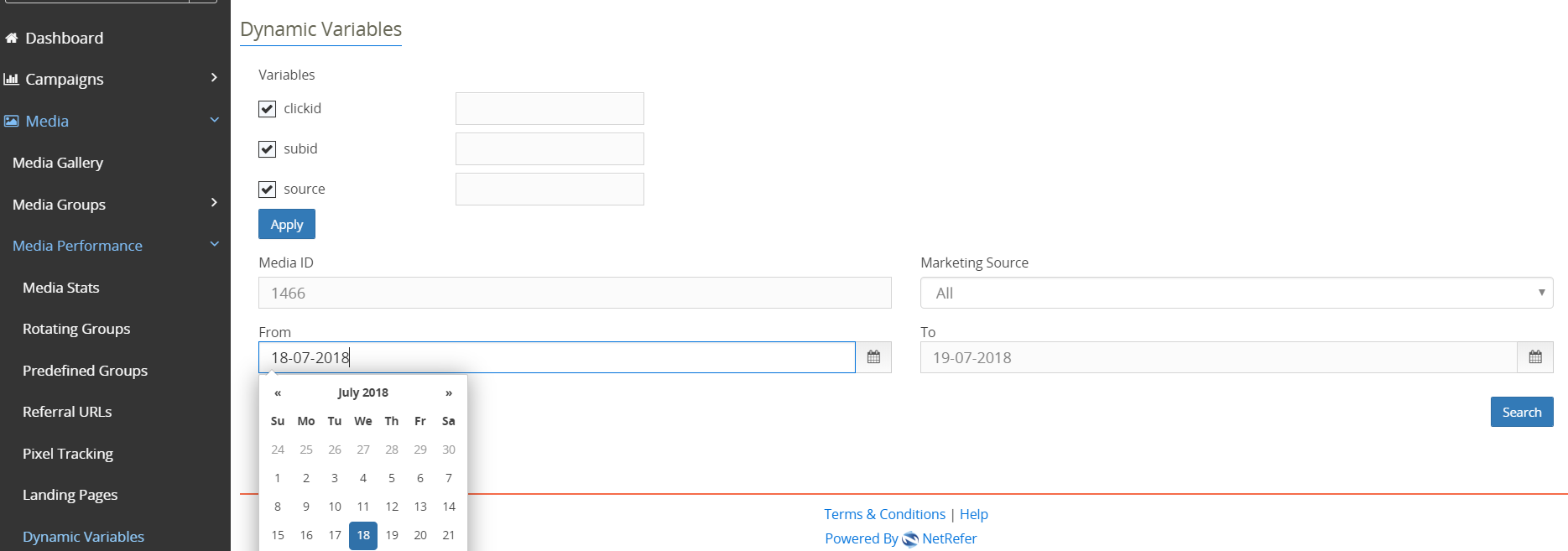 - Chose the preferred dynamic variable parameter(s), the marketing source, and report's date range.